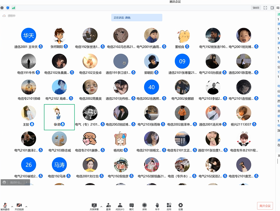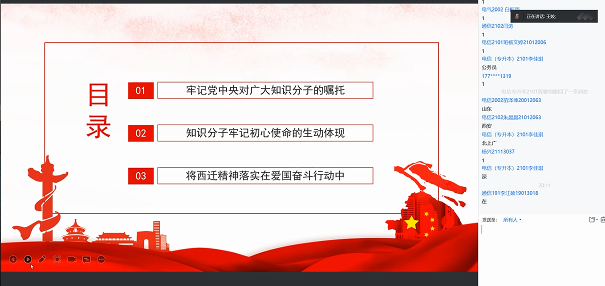 为引导我系青马学员能够肩负起历史的使命感与时代的责任感,过腾讯会议线上举办了题为 “做新时代西迁精神新传人”的青马工程大学生骨干培训班最后一讲。主讲人为电信系主任助理,学生党支部书记王姣,参与本次培训人员有电信系团工委书记徐娟、部分党员及全体青马学员,主持人张何朝阳。