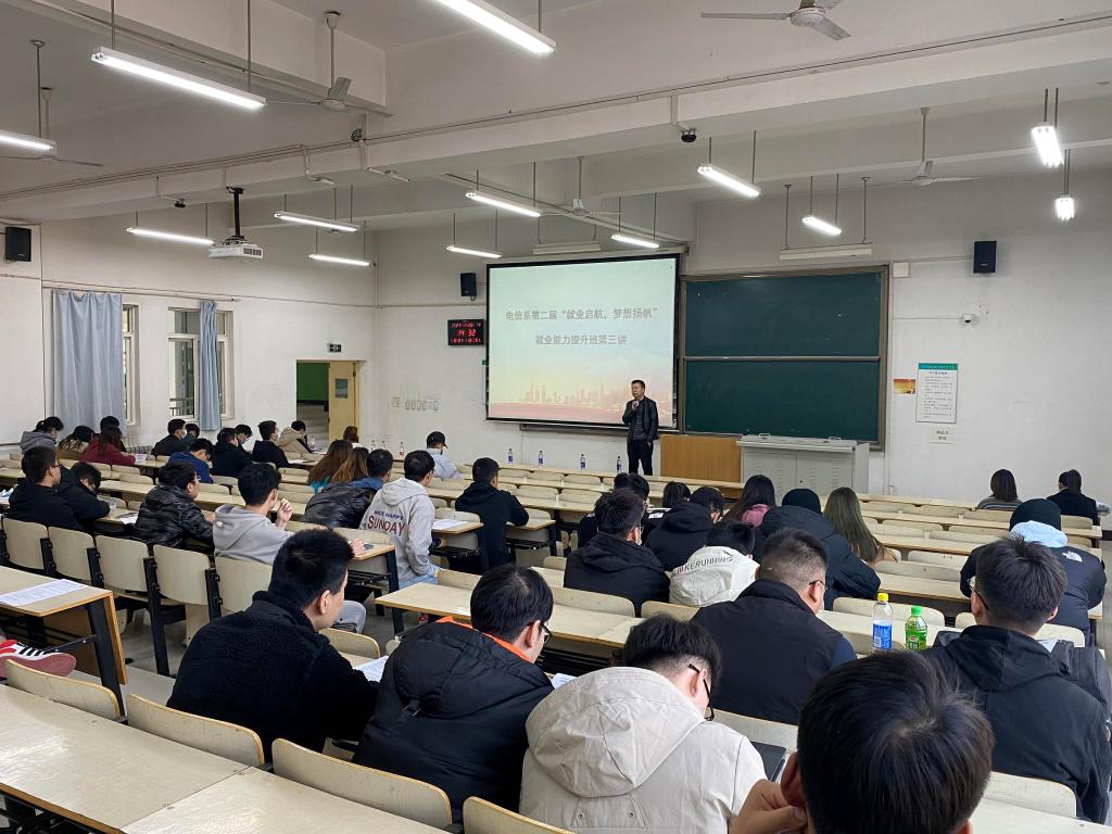 首先,由电信系主任助理张建进行开场发言,他强调,目前阶段作好职业规划是毕业生重中之重的工作,同学们要对自己有清楚的认知,对行业有正确的了解,这样才能做出正确地选择,并且全心全意地努力才能实现自己的梦想。