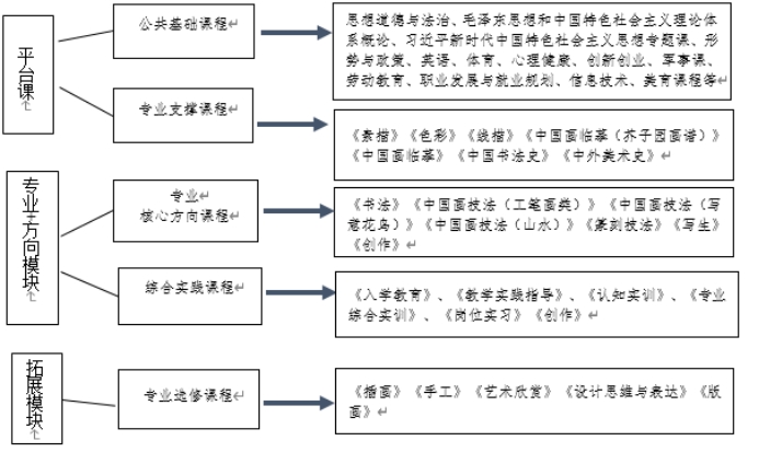 1. 能胜任中小学、幼儿园美术课程、各种早教机构、培训学校等美术教学研究的教学与管理工作 2.具有较强的创作技能与就业创业能力,在书画艺术团体、文化单位从事书画与艺术管理工作 3.在艺术创意机构与企业从事美术专业与创意设计工作 |