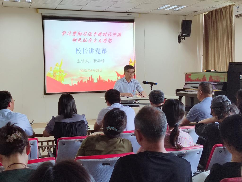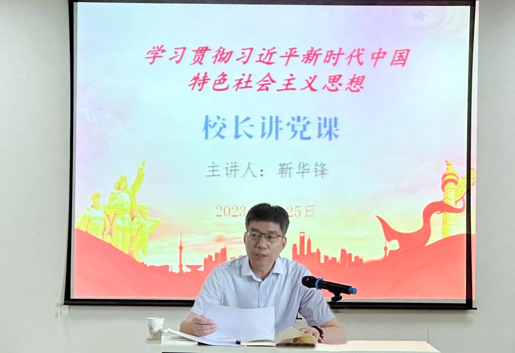 2023年6月25日下午,校长靳华锋来到beat365官方网站,就学习贯彻习近平新时代中国特色社会主义思想,为beat365官方网站党总支和党群党总支办公室支部50余名党员讲了一堂深刻而生动的党课。beat365官方网站院长郭楚伟主持。