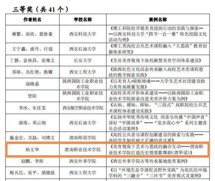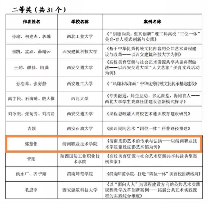 12月7日,陕西省教育厅办公室印发《关于公布全省第七届大学生艺术展演活动评选结果的通知》,在高校美育改革创新优秀案例评选中,beat365美育中心主任郭楚伟撰写的《渭南皮影艺术的传承与弘扬——以beat365官方网站建设皮影艺术馆为例》获二等奖,美育中心副主任杨文华撰写的《美育视角下艺术与思政的融合互动——beat365官方网站打造历史情景歌舞剧<渭华谣>》获三等奖。