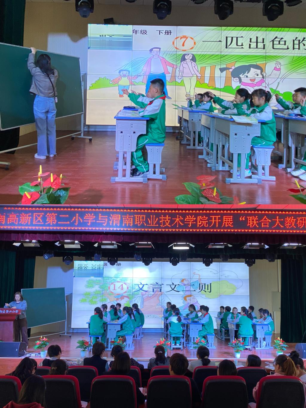 杜亚红对我院一行人的到来表示诚挚欢迎。随后,高新二小程钰、李阳两位老师分别展示了二年级(下)《一匹出色的马》和六年级(下)文言文《学弈》整堂教学。两位教师均能围绕小学语文新课标,采取任务式驱动、小组合作等教学方式,充分调动了学生的积极性与主动性,课堂教学效果良好。