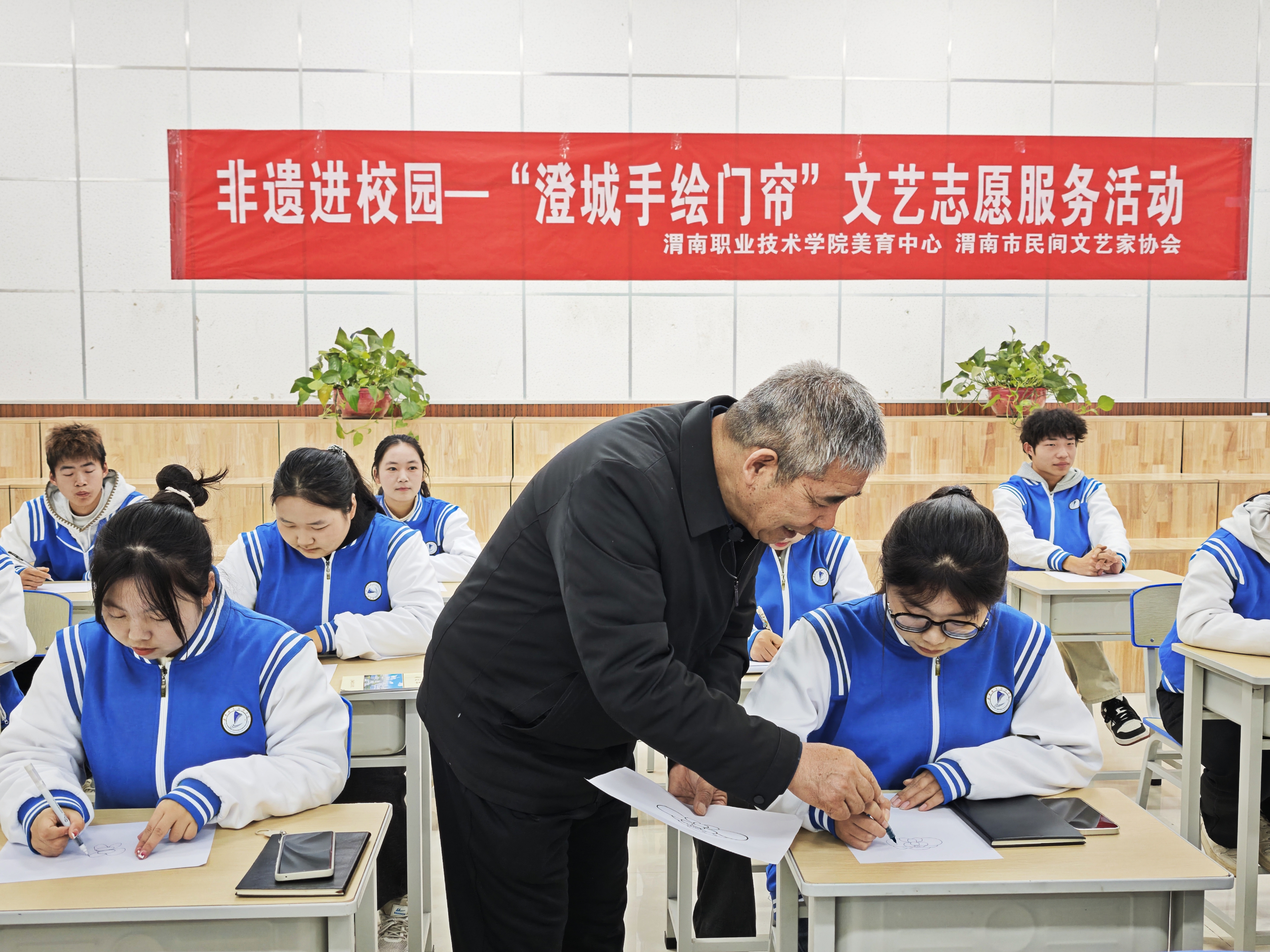 李天社结合自己的作品指出,手绘门帘是澄城县一种独特的艺术形式,展示了一种美妙的生活方式和情趣,不仅美化了人们的生活空间,更在无形中传达着对美好生活的向往和对传统文化的尊重。他强调,在快节奏的现代生活中,手绘门帘作为文化的象征,为人们提供了一片静谧的思考空间,让大家在忙碌之余,能够感受到来自古老文化的力量与温暖。随后,他现场作画演示并指导同学们实践学习。