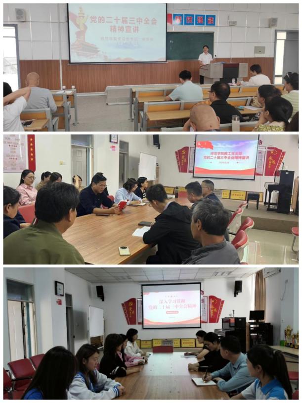 10月9日,教工党支部和学生党支部分别召开会议,学习传达党的二十届三中全会精神。学习好贯彻好党的二十届三中全会精神,是一项重大政治任务。通过学习宣讲,增强了广大党员、干部、师生学习宣传贯彻全会精神的思想自觉和行动自觉,提升党员干部的政治素养和教书育人能力,着力培养高素质高技能人才,为推进教育强国建设,实现学院高质量发展贡献新的、更大的力量。(撰稿:beat365官方网站 韩宜君 审核:杨瑞侠)